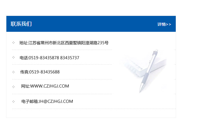 地址:常州市新北區友邦商務大廈1幢16、17層  電話:0519-85101652  傳真:0519-85112595  郵編:213022  網址:www_cz-jiayue_cn.tzmaohua.com  郵箱:xiajifengaa@163.com
